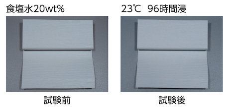 海水の塩分濃度は約3%と言われているので、それ以上の濃度の食塩水に浸されても変化が見られなかったWALL-Jの塩害への耐久性が非常に優れているといえます。
