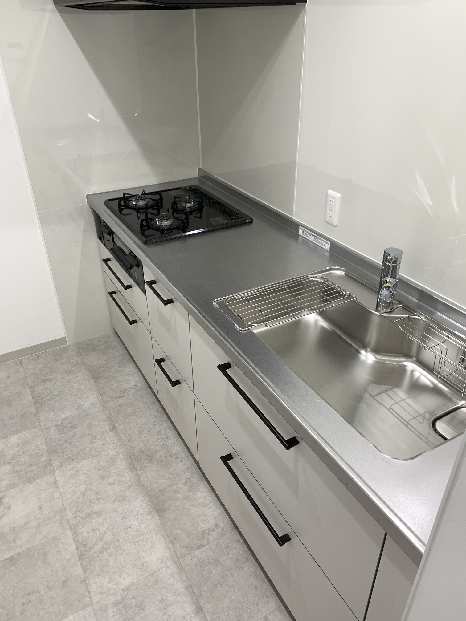 扉のお色は床と合わせてグレーです。ブラックのラウンド取っ手がアクセントとなりホテルライクな印象で素敵ですね!