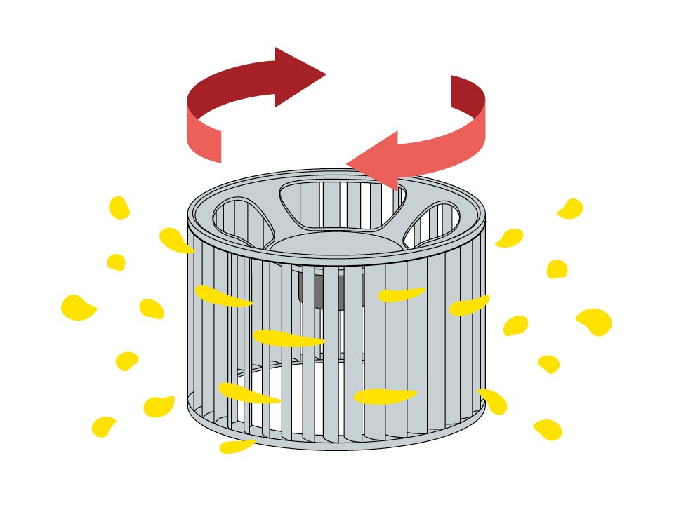 撥油コートを施したファンが回転することで、付着油を弾き飛ばします。 油はオイルパックに集まります。