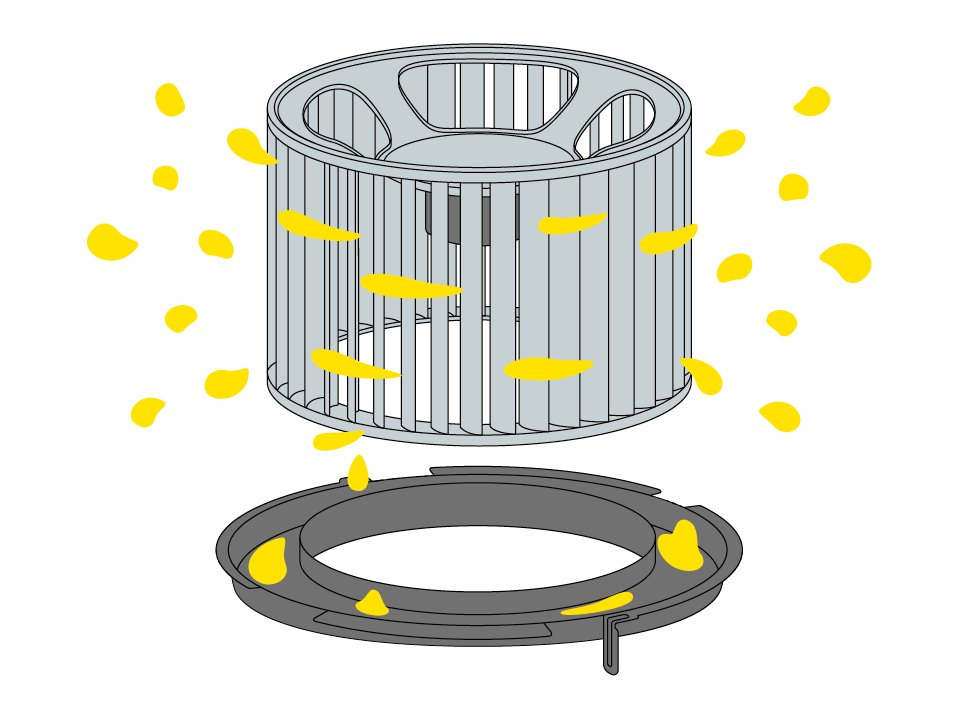 撥油コートを施したファンが回転することでファンに付着した油が弾け飛び、換気量の低下の原因になる付着油を軽減。面倒なファンのお手入れをしなくても、10年間継続してお使いいただけます。
